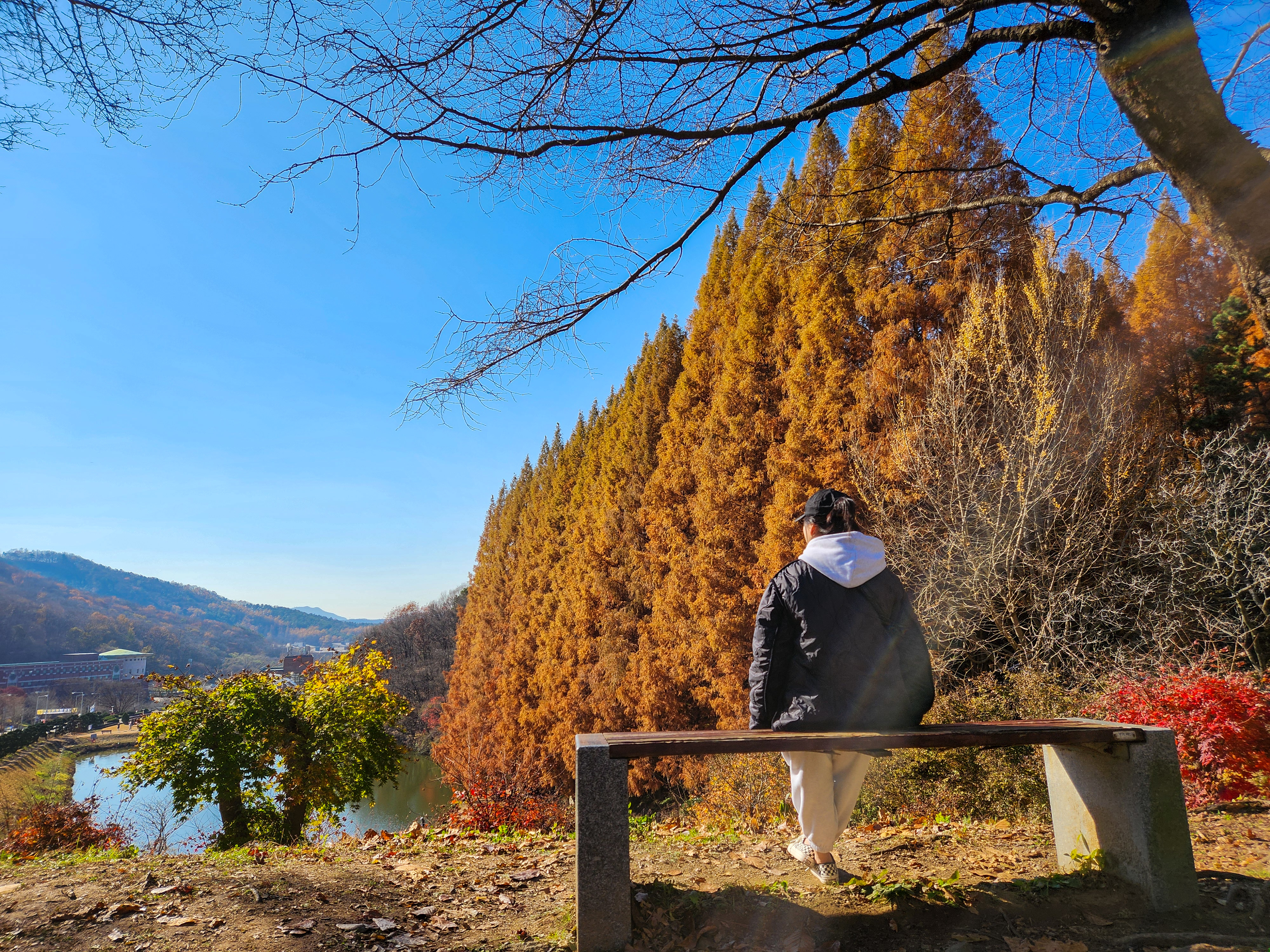 그런데 필자가 기대가 조금 컸는지.. 예쁘긴 했지만 명수당 메타세콰이어 나무길이 길진 않았다. 약 200M 정도 되는 길이 있고 바로 앞에 저수지가 하나 있다.