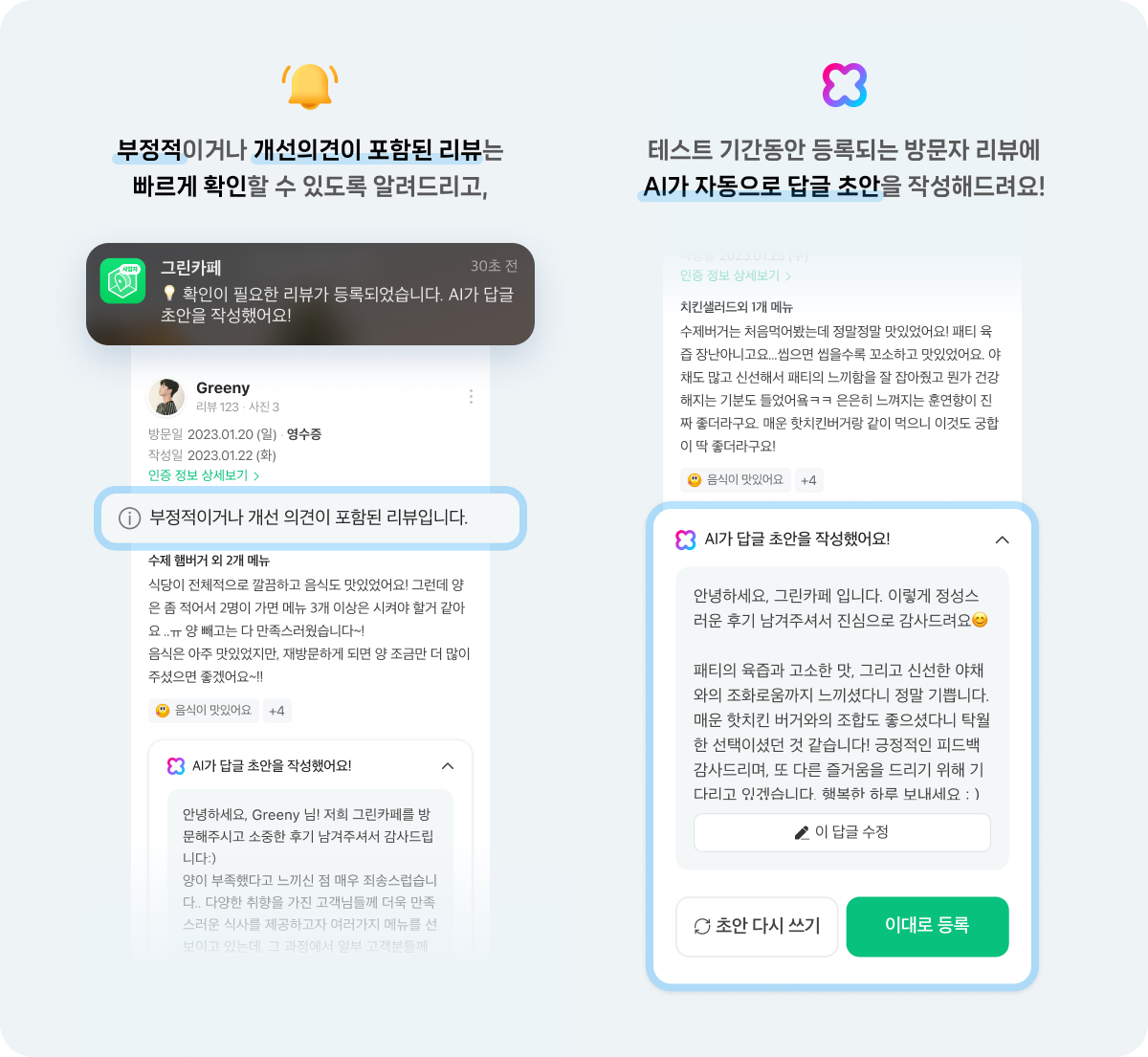 리뷰가 달리면 AI가 자동으로 답글 초안을 작성해 주고, 사업주는 간편하게 초안을 그대로 등록하거나, 직접 내용을 다듬은 후에 등록할 수도 있다.