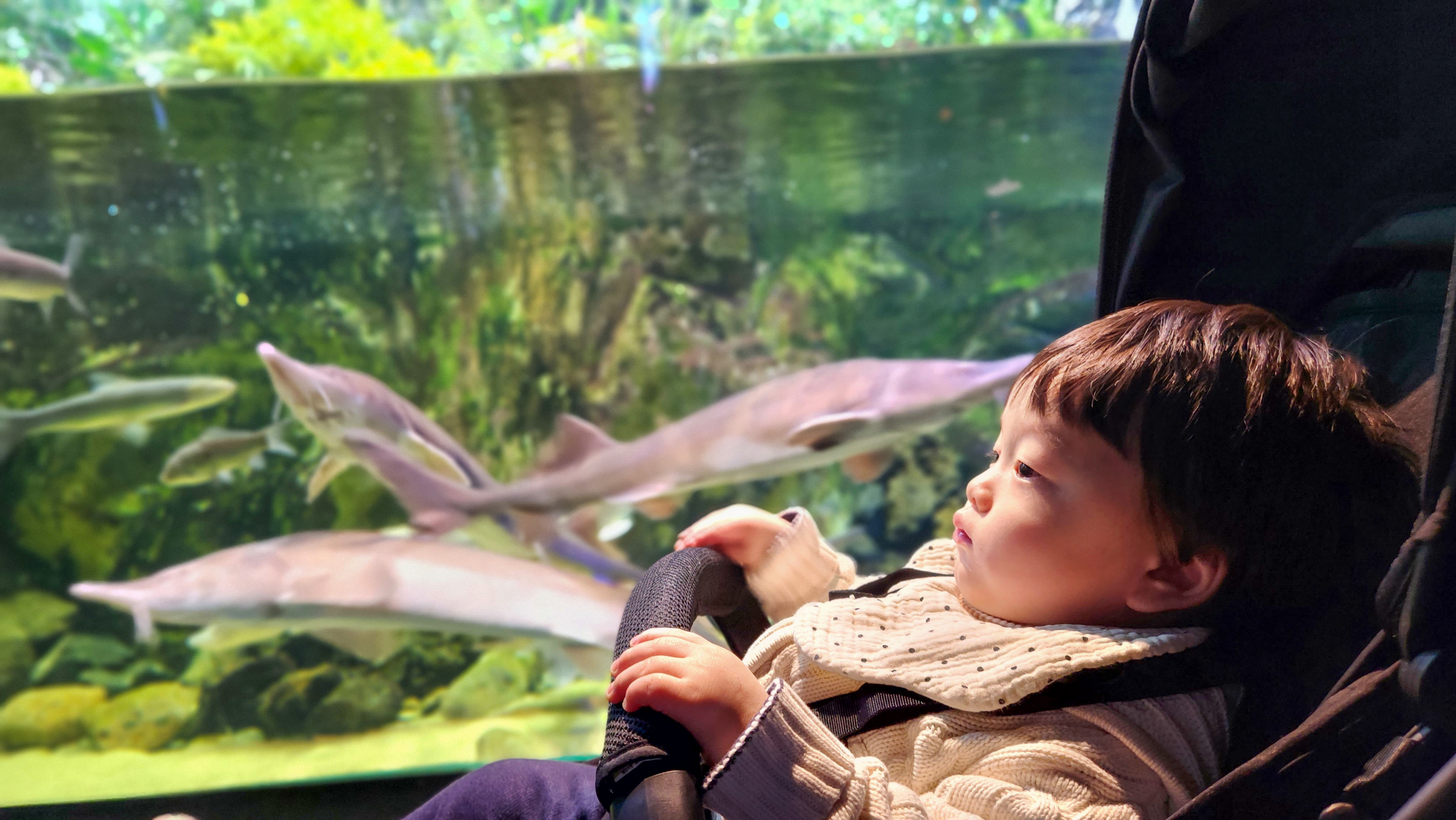 들어서자마자 열무 눈 돌아간다. 워낙 물을 좋아해서 그런가? 물고기가 부러운 건가? 눈을 떼지 못하더라. 입구에 철갑상어가 있는데 필자도 철갑상어는 처음 보는 거 같다. 철갑상어 이름만 보면 상어라고 오해할 수 있는데, 상어는 연골어류이고 철갑상어는 경골어류로 상어와 전혀 관련이 없다. 철갑상어를 보며 캐비어가 떠올랏..