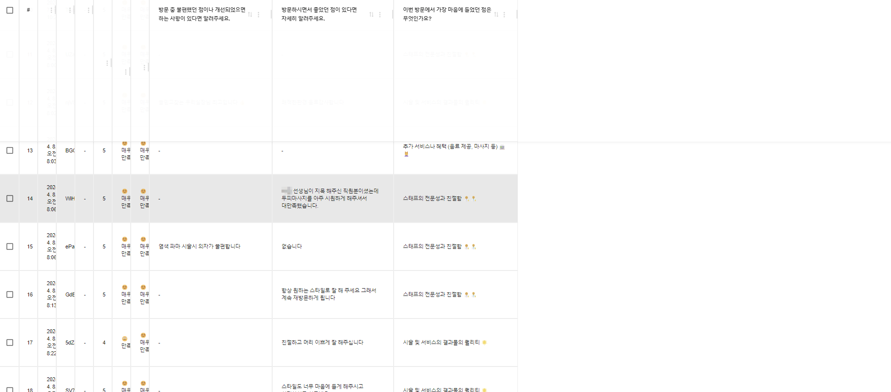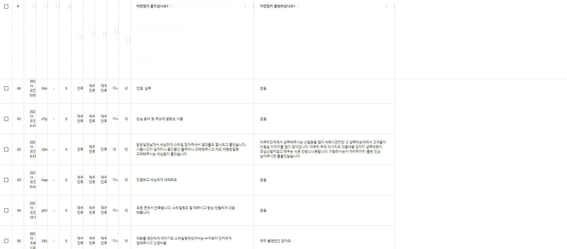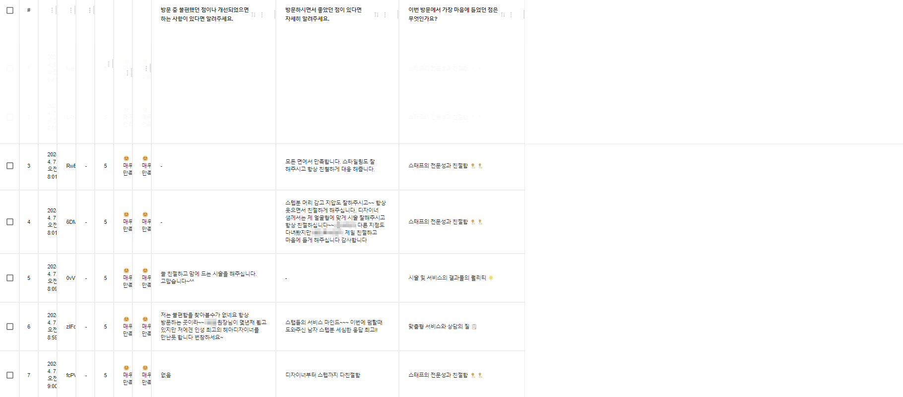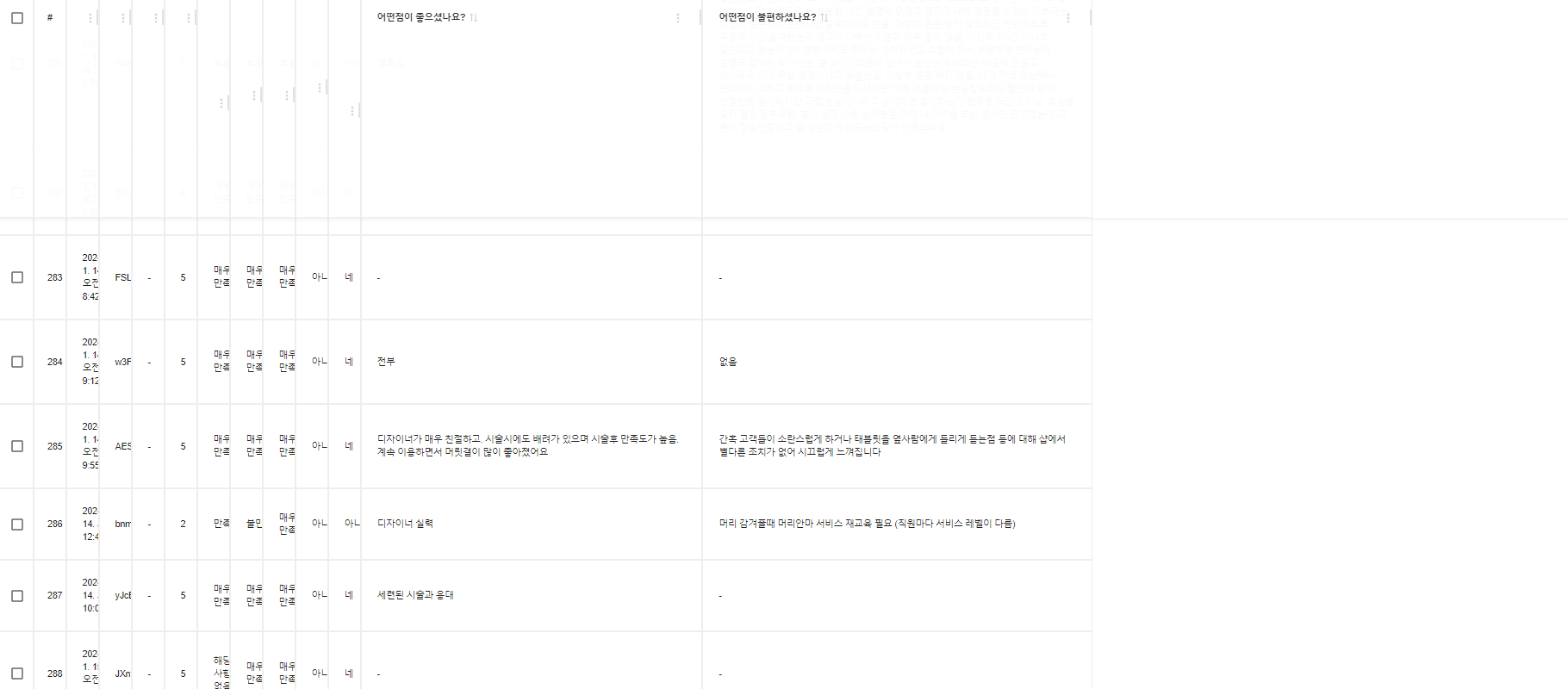 작년 23년 11월부터 시작해서 A미용실에서 소비자 만족도 조사를 실시했다. 이를 통해 많은 피드백과 의견들을 수집할 수 있었고, 그중 일부는 미용실 운영에 큰 영향을 미쳤다.