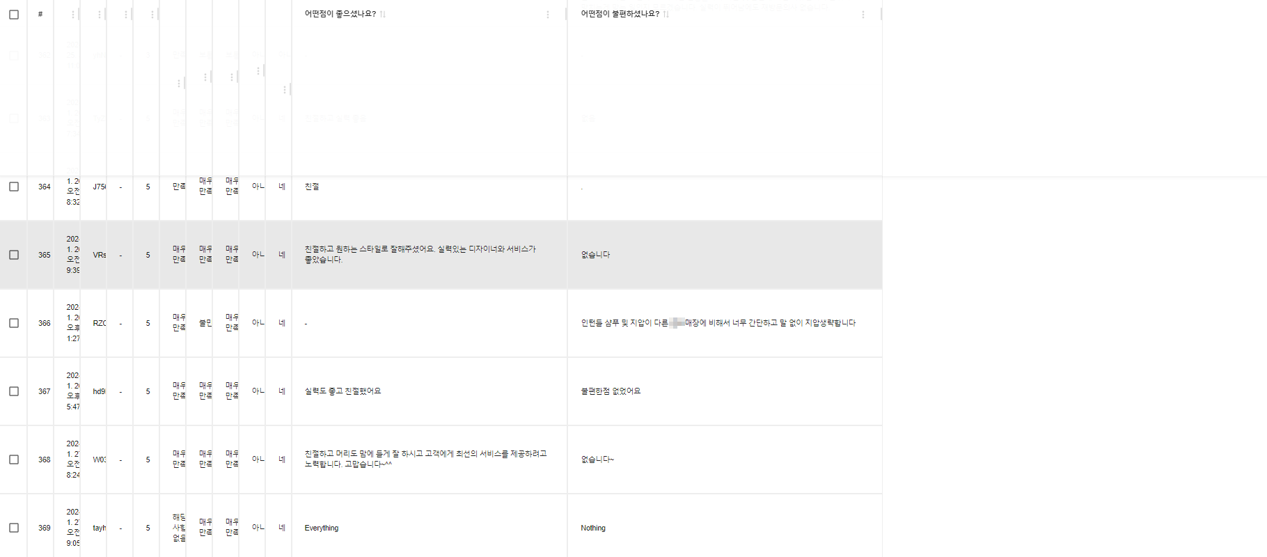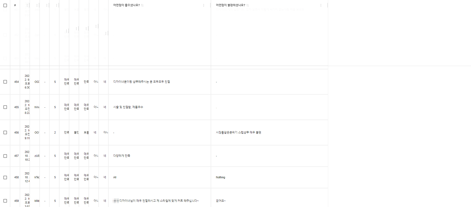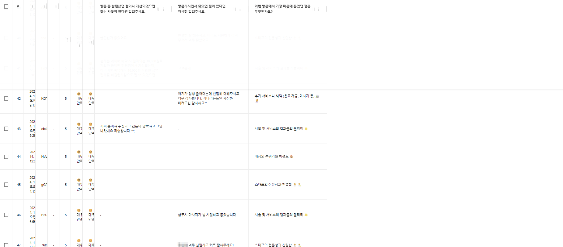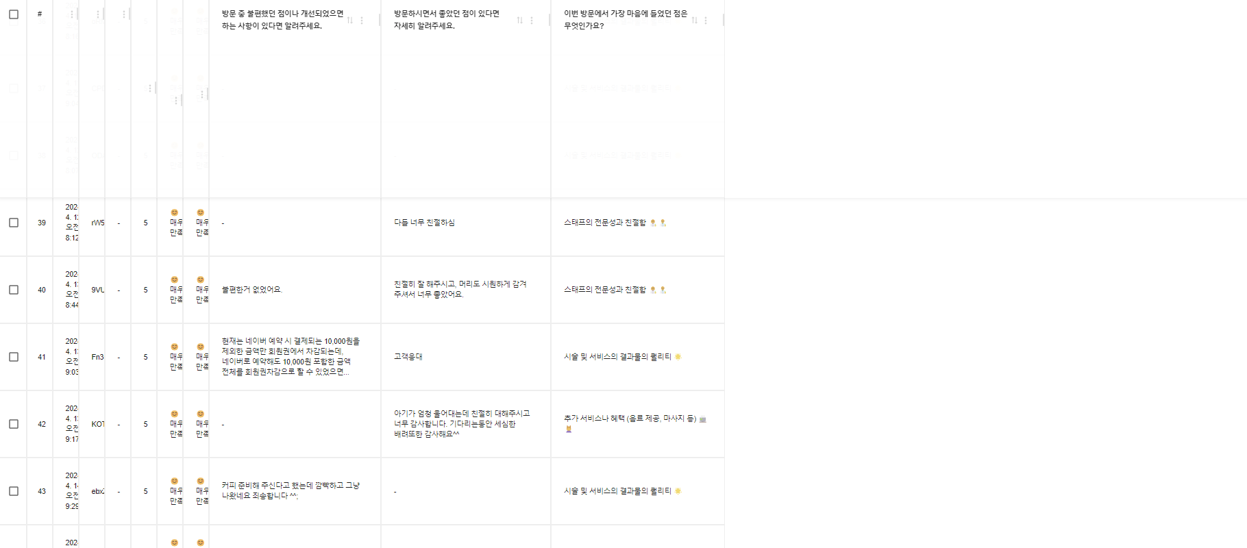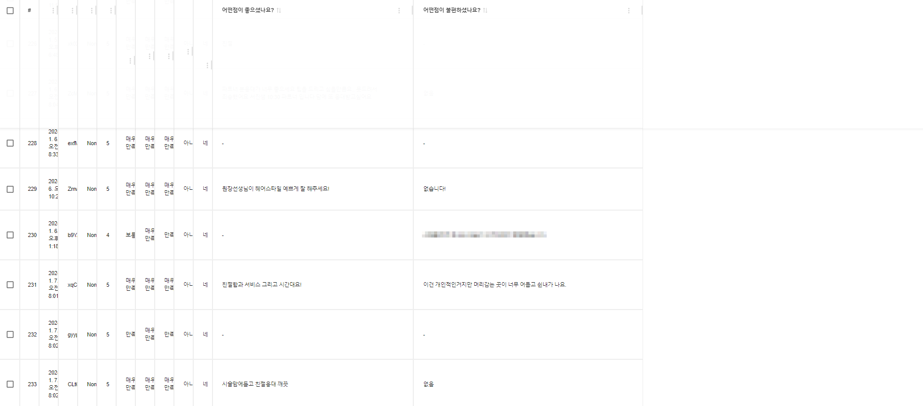 작년 23년 11월부터 시작해서 A미용실에서 소비자 만족도 조사를 실시했다. 이를 통해 많은 피드백과 의견들을 수집할 수 있었고, 그중 일부는 미용실 운영에 큰 영향을 미쳤다.