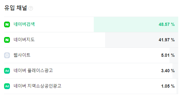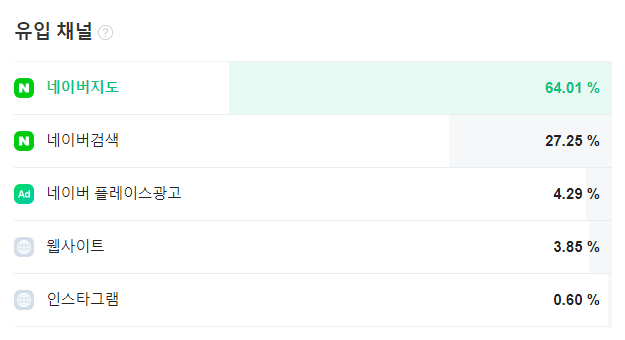 플레이스 유입 채널에서 네이버 지도 유입량을 보면 네이버 검색과 비슷하거나 혹은 네이버 검색보다도 많은 비중을 차지하고 있다. 적게는 30%부터 많게는 60% 이상까지도 유입되고 있는데 22년까지만 해도 네이버 지도 유입량은 크지 않았다. 하지만 작년부터 점점 증가하는 추세를 보이고 있다.
