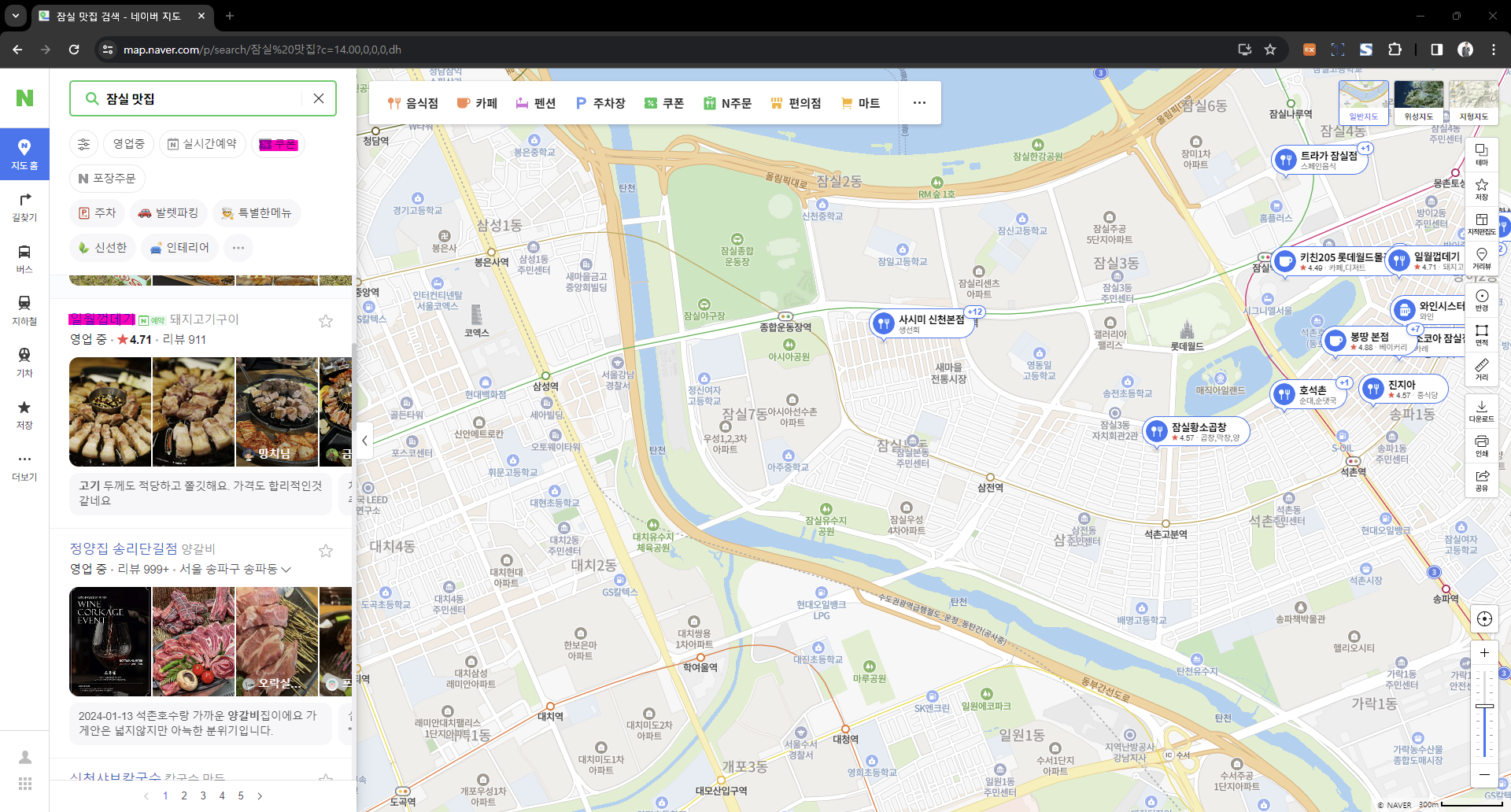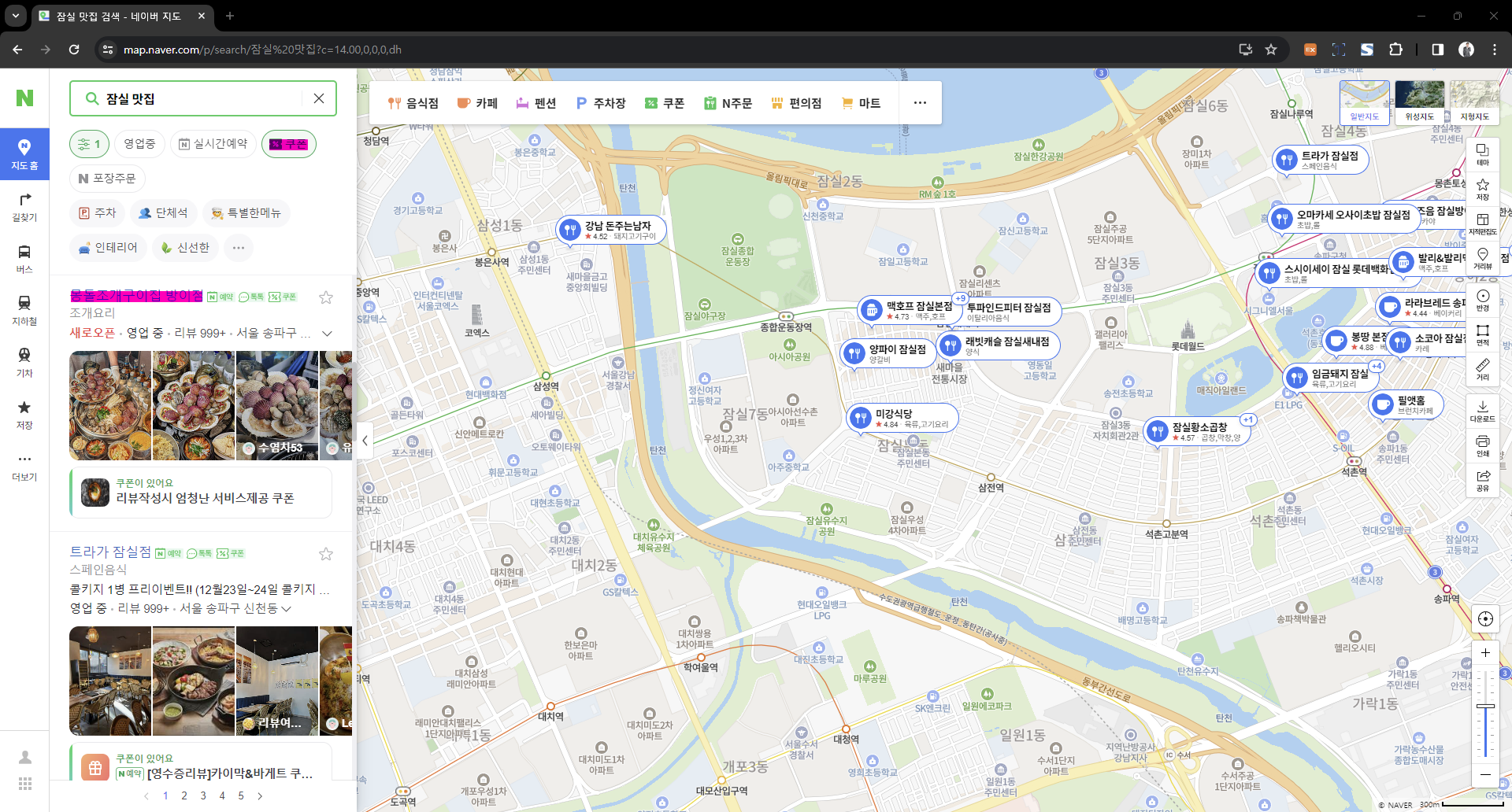 잠실 맛집 키워드로 검색 시 '일월껍데기'집이 1위로 노출 중이다. 그리고 쿠폰을 클릭해 필터링을 걸면 '몽돌조개구이집 방이점'이 1위 노출로 바뀐 걸 볼 수 있다.