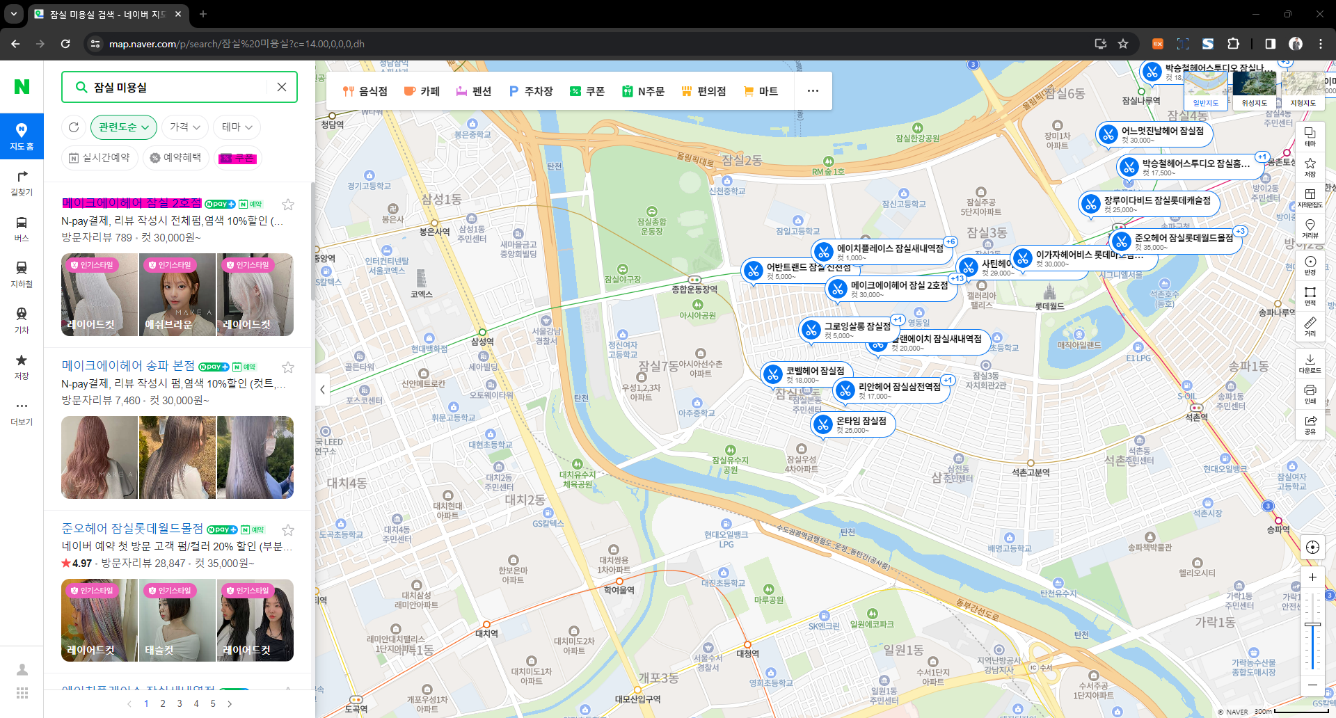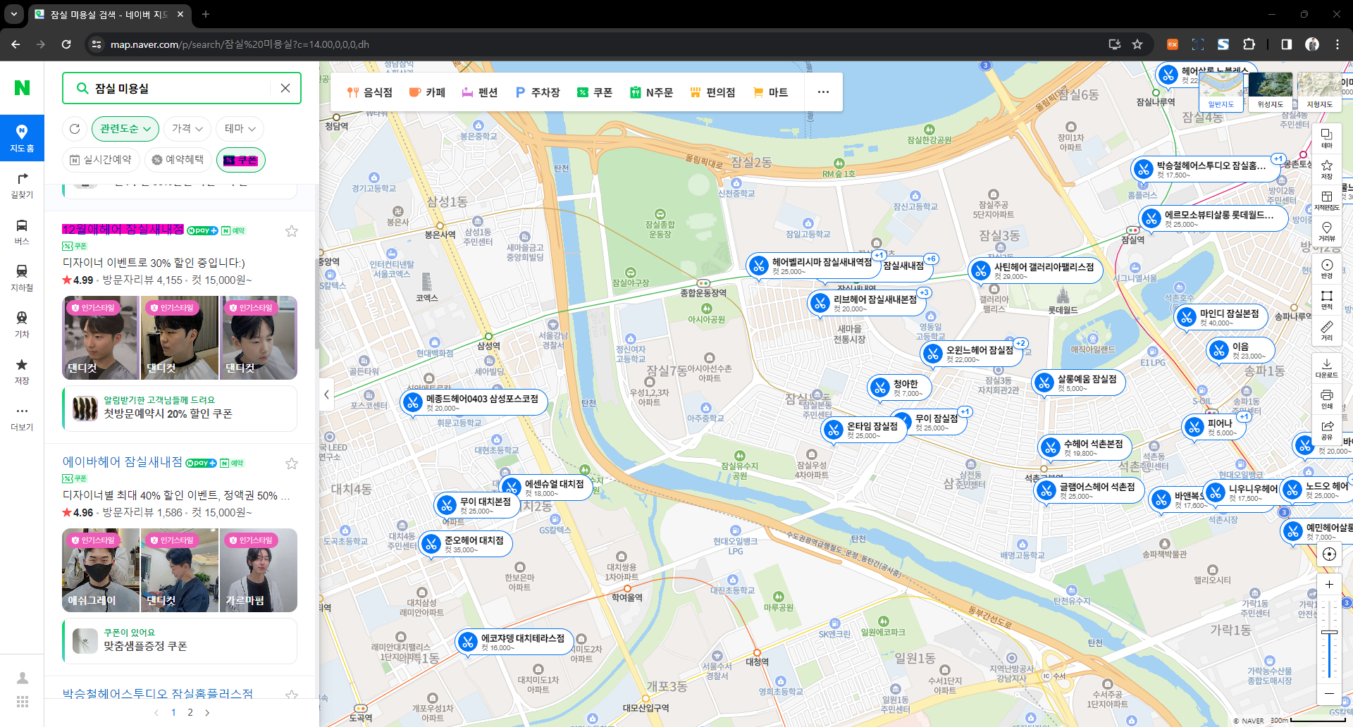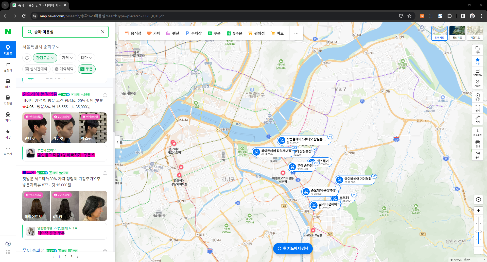 송파 미용실 검색 후 쿠폰을 필터링한 상태다.