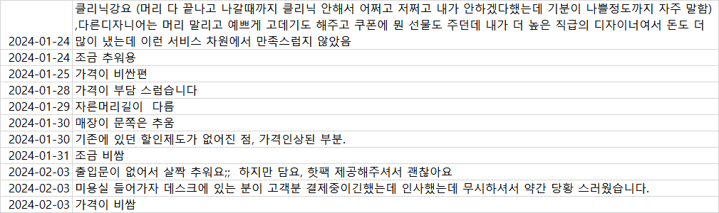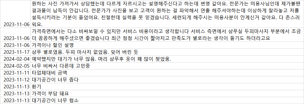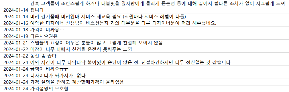 고객이 미용실에서 받은 서비스에 불만족을 느끼는 경우, 재방문을 하지 않을 가능성이 매우 높다. 예를 들어, 고객의 머리를 손질하는 데 시간이 오래 걸리거나, 고객의 요구사항을 제대로 반영하지 못하는 경우 등등 고객의 만족도가 떨어질 수 있다. - 가격 경쟁력 부족
