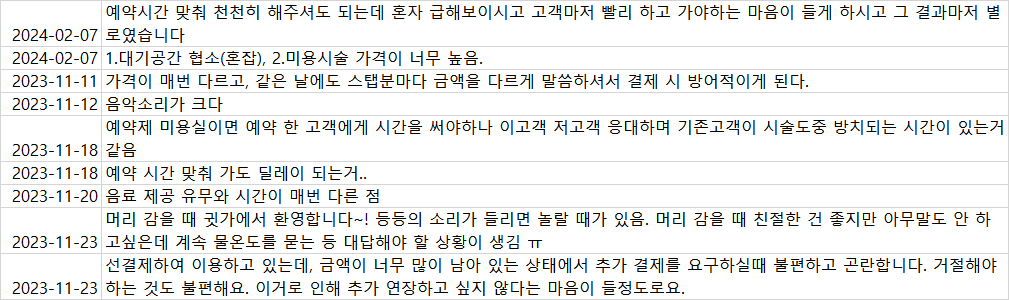 미용실의 가격이 다른 미용실에 비해 비싸거나, 가격 대비 서비스 품질이 떨어지는 경우 고객의 만족도가 떨어질 수 있다. - 고객 관리 부족