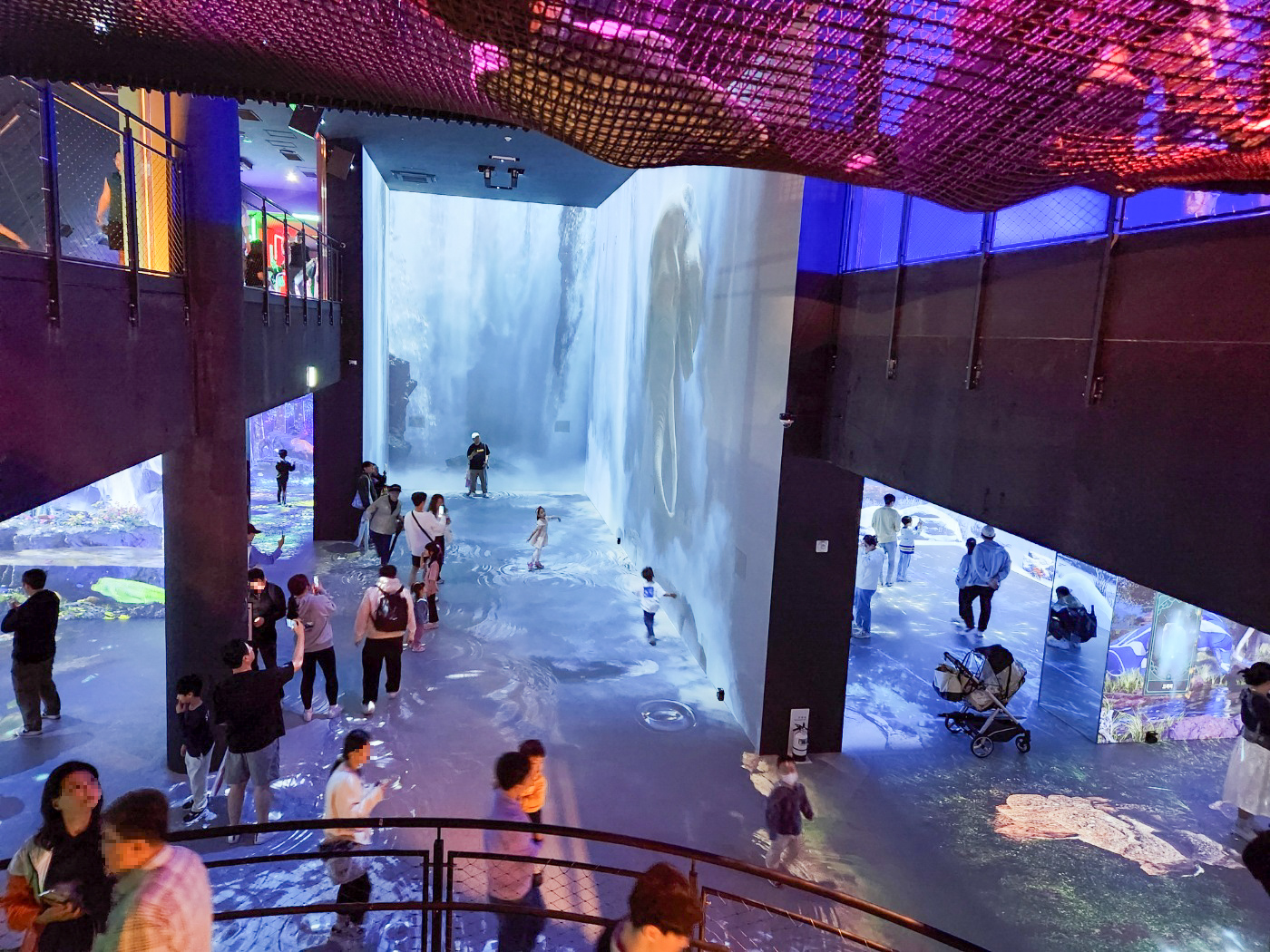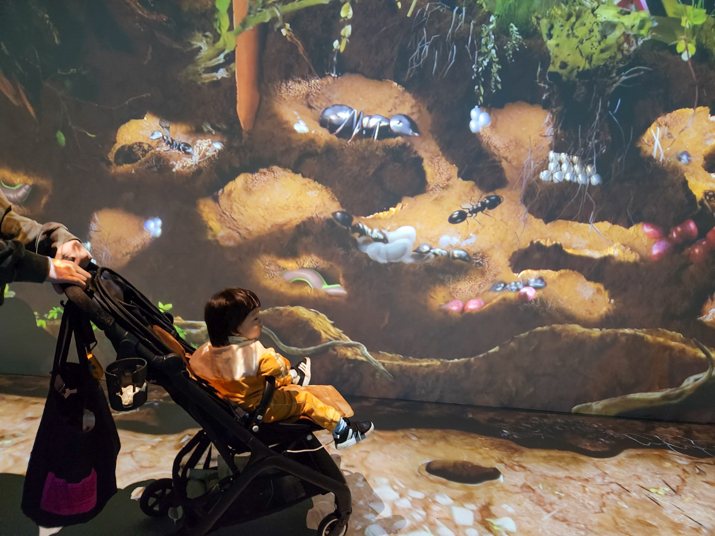 이렇게 벽면이 대형 스크린으로 되어 있고, 다양한 동물들을 볼 수 있는데 핸드폰에 어플을 설치하면 포켓몬 잡듯이 동물을 잡을 수 있다고 한다. 아직 우리 열무에게는 어렵지만, 조금 큰 아이들은 띄어 다니며 동물 잡기 바쁘더라, 그중 일부 어른들도 동물을 열심히 잡고 있었는데.. 필자는 귀찮아서 패스했다.