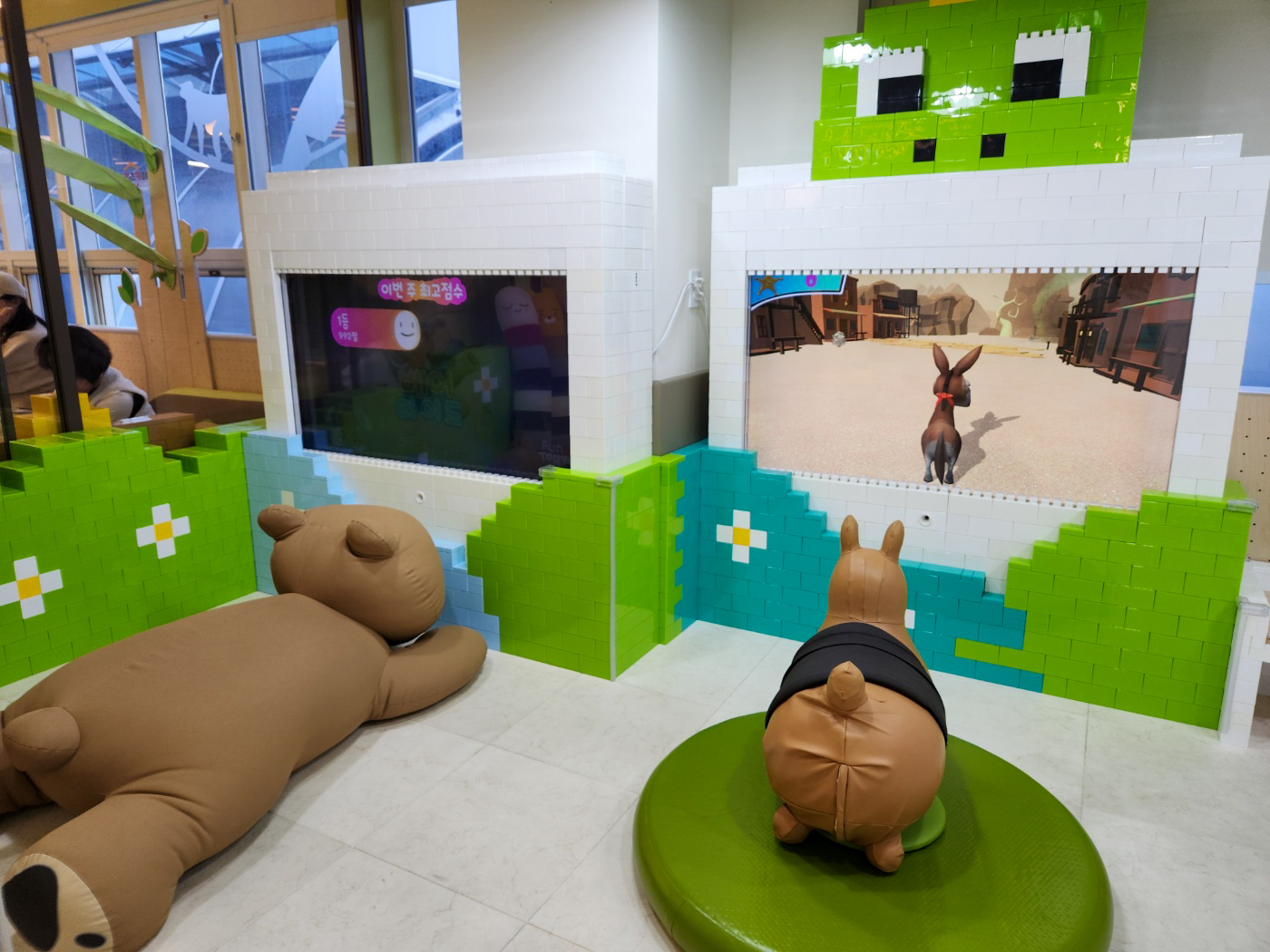 카페 입구 쪽에 스마트 공간이라고 곰이랑 당나귀를 타고 움직이면 화면에서 따라 움직인다. 당나귀는 아직 다리가 짧아서 못 타보고 곰돌이는 가르쳐 주지 않았는데 앞에 누나가 하는 걸 보고 스스로 올라타 움직여도 보는데 확실히 이런 미디어는 누가 안 알려줘도 스스로 터득을 잘한다.