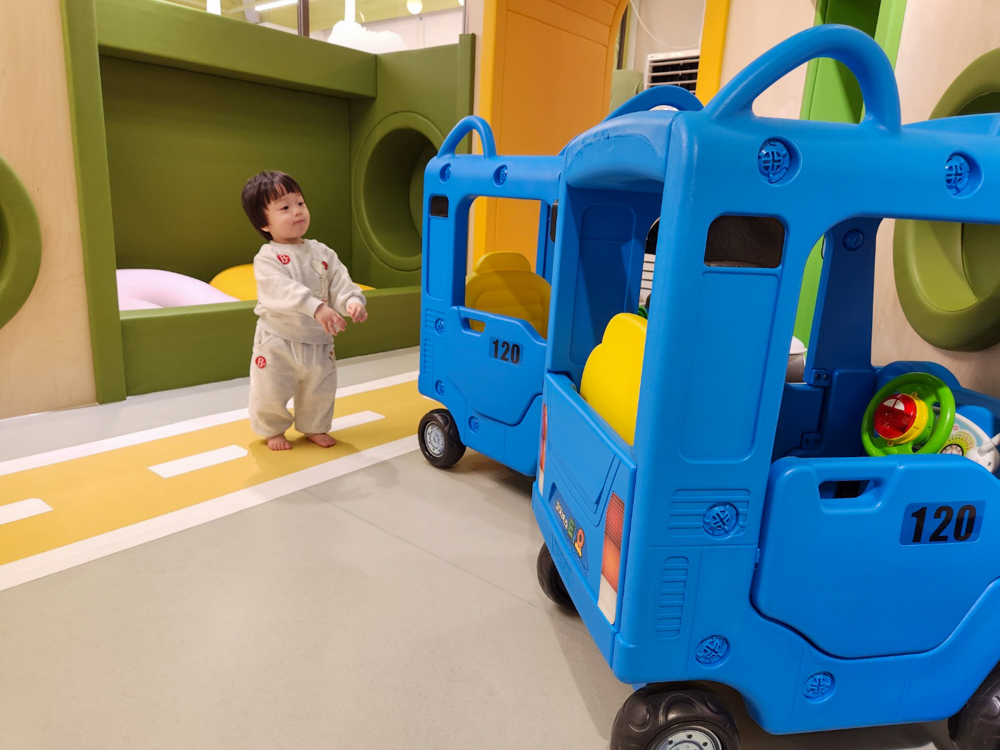 여기 주차는 정말 최악이지만, 키즈카페는 자동차 맛집이다. 여러 종류의 자동차 장난감이 많은데 열무도 뭐부터 타야 하나 고민 중이다. 역시나 파란색을 좋아해서 일단 타요 자동차부터 시승 중이다.