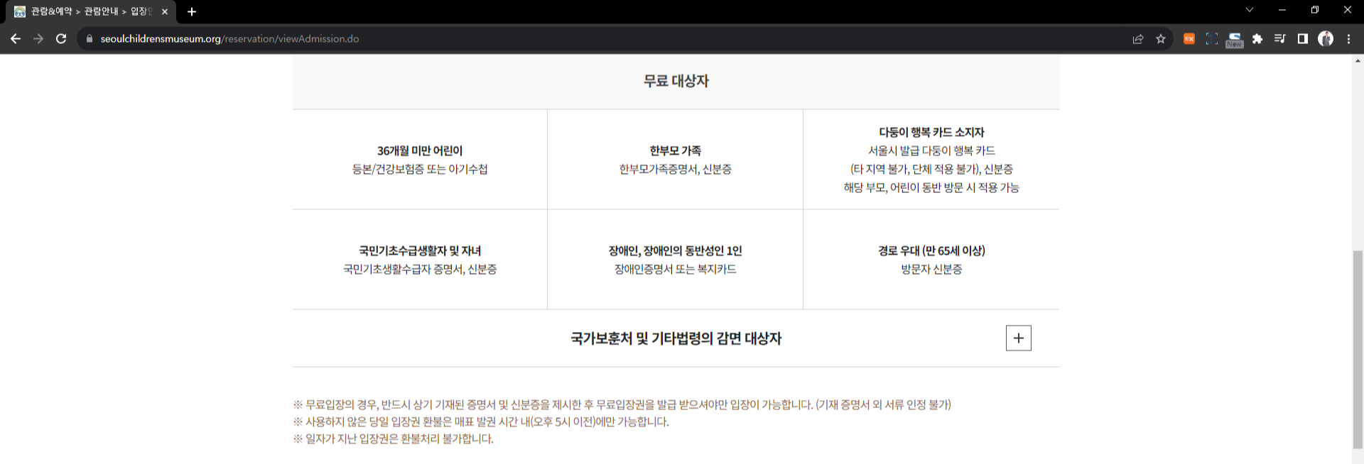 그 외 무료 대상자 및 감면 대상자는 홈페이지에서 확인하길 바란다.