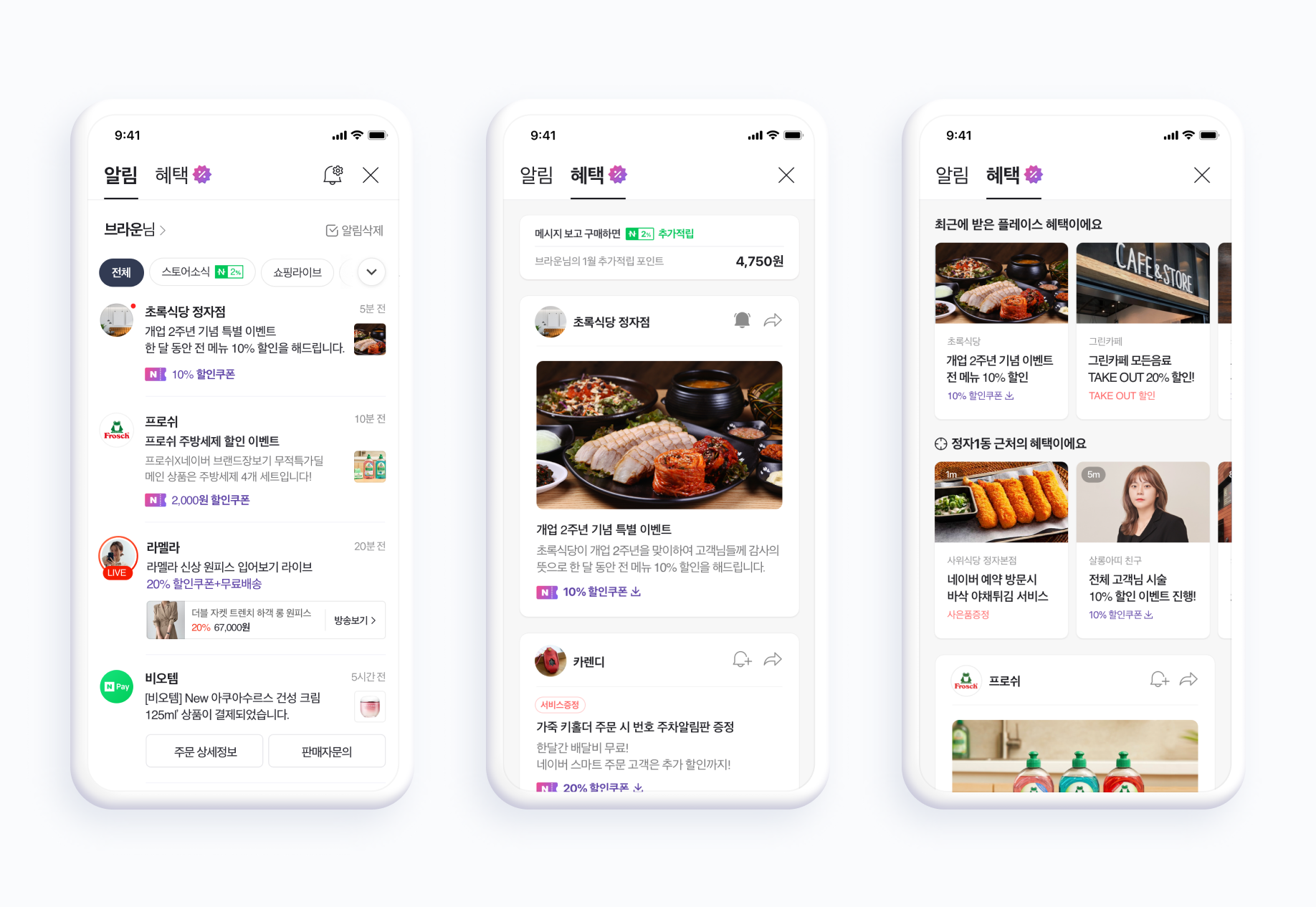 네이버 앱 푸시(PUSH) 알람을 바빠서 확인하지 못했을 경우, 네이버 앱 알림/혜택 탭에 들어가면 언제든지 메시지 확인이 가능하다. 그리고 추후 알림받기를 하지 않아도 위치 기반으로 관심이 있을 만한 고객에게 발송된 메시지를 추천하는 기능도 도입될 예정이다.