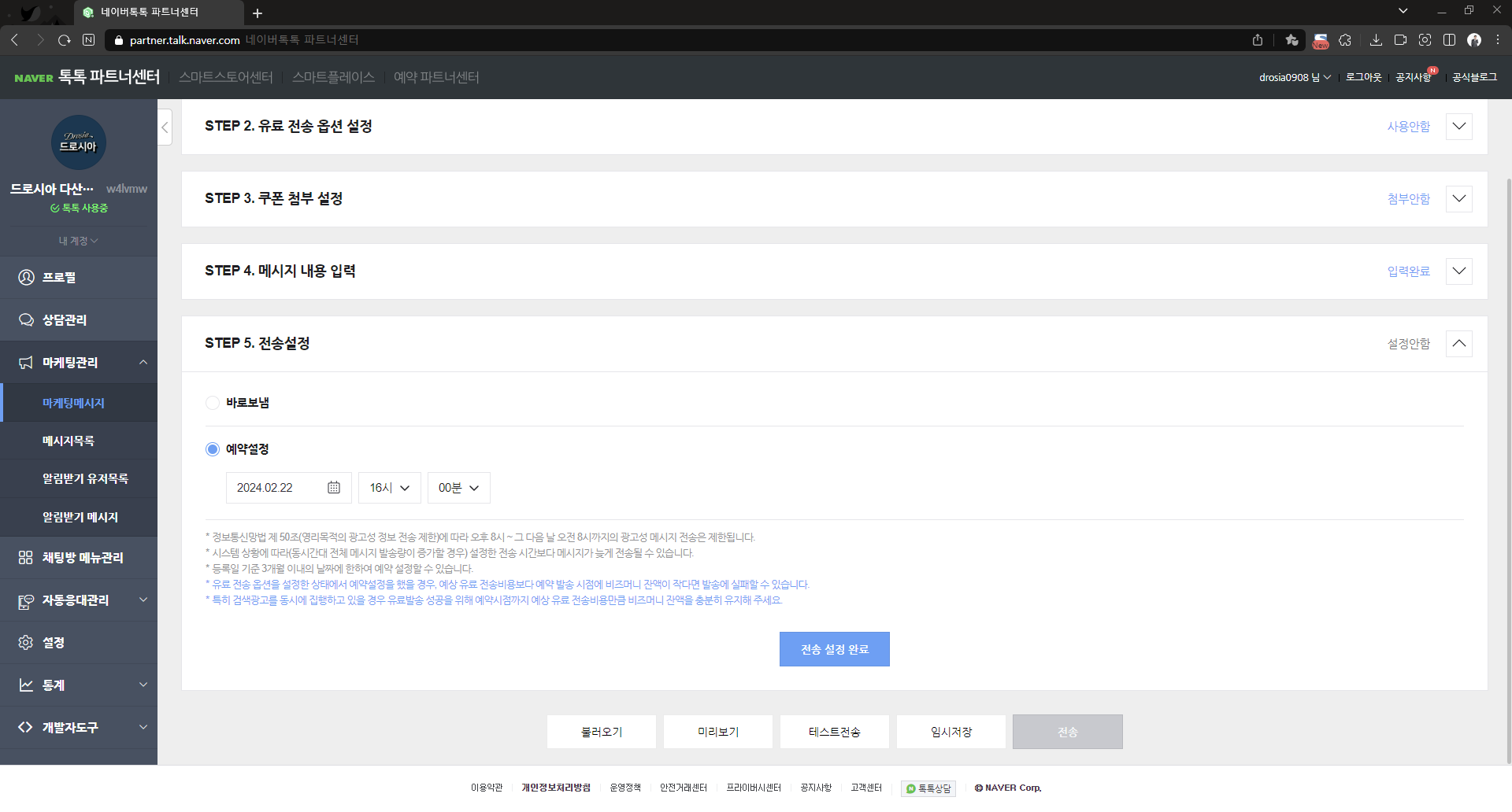• STEP5. 전송 설정 : 메시지 전송 시간 선택(예약 발송 가능)