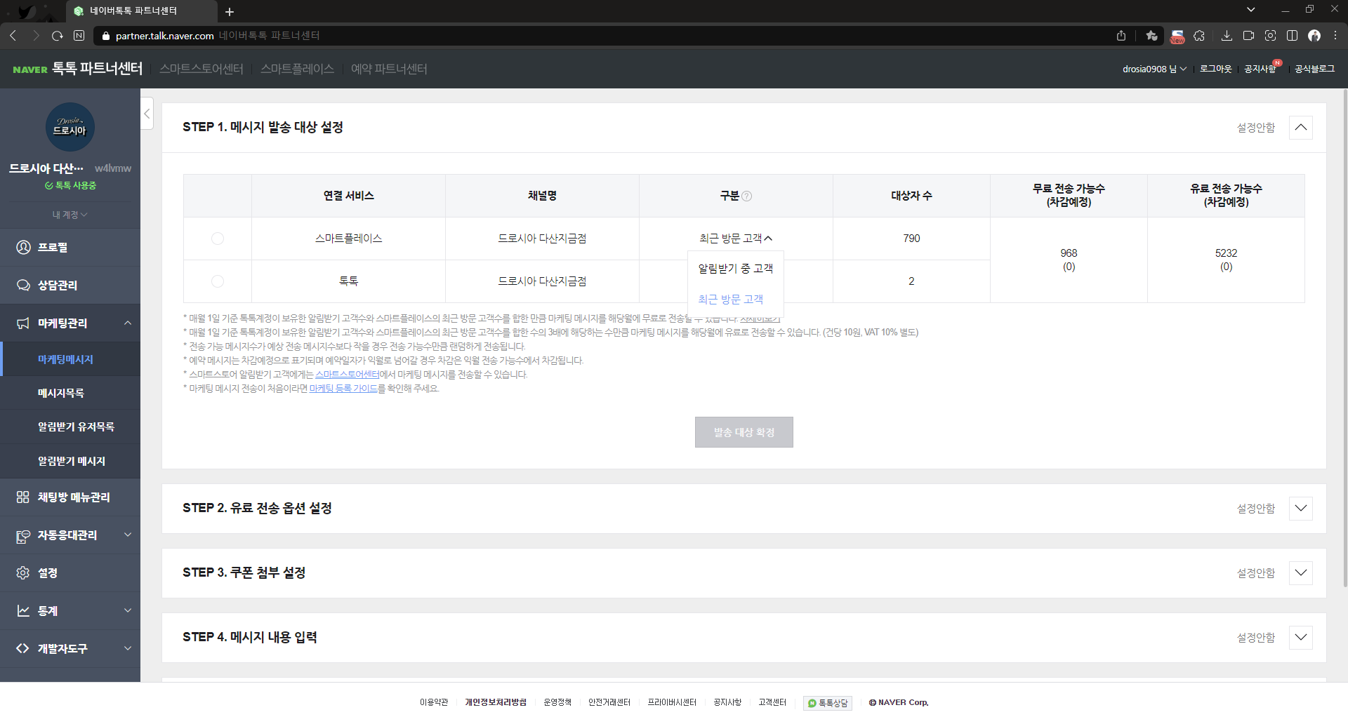 • STEP1. 메시지 발송 대상 설정 : 연결 서비스 채널 및 대상 선택