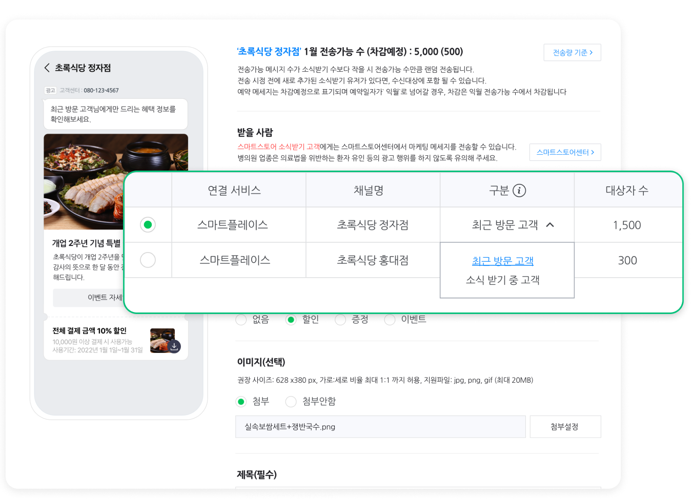 톡톡 파트너센터 및 스마트플레이스 마케팅 메뉴를 통해 발송이 가능하며, 발송 구분은 "최근 방문 고객" 또는 "소식받기 중 고객" 2가지 중 선택하여 발송 가능하다.