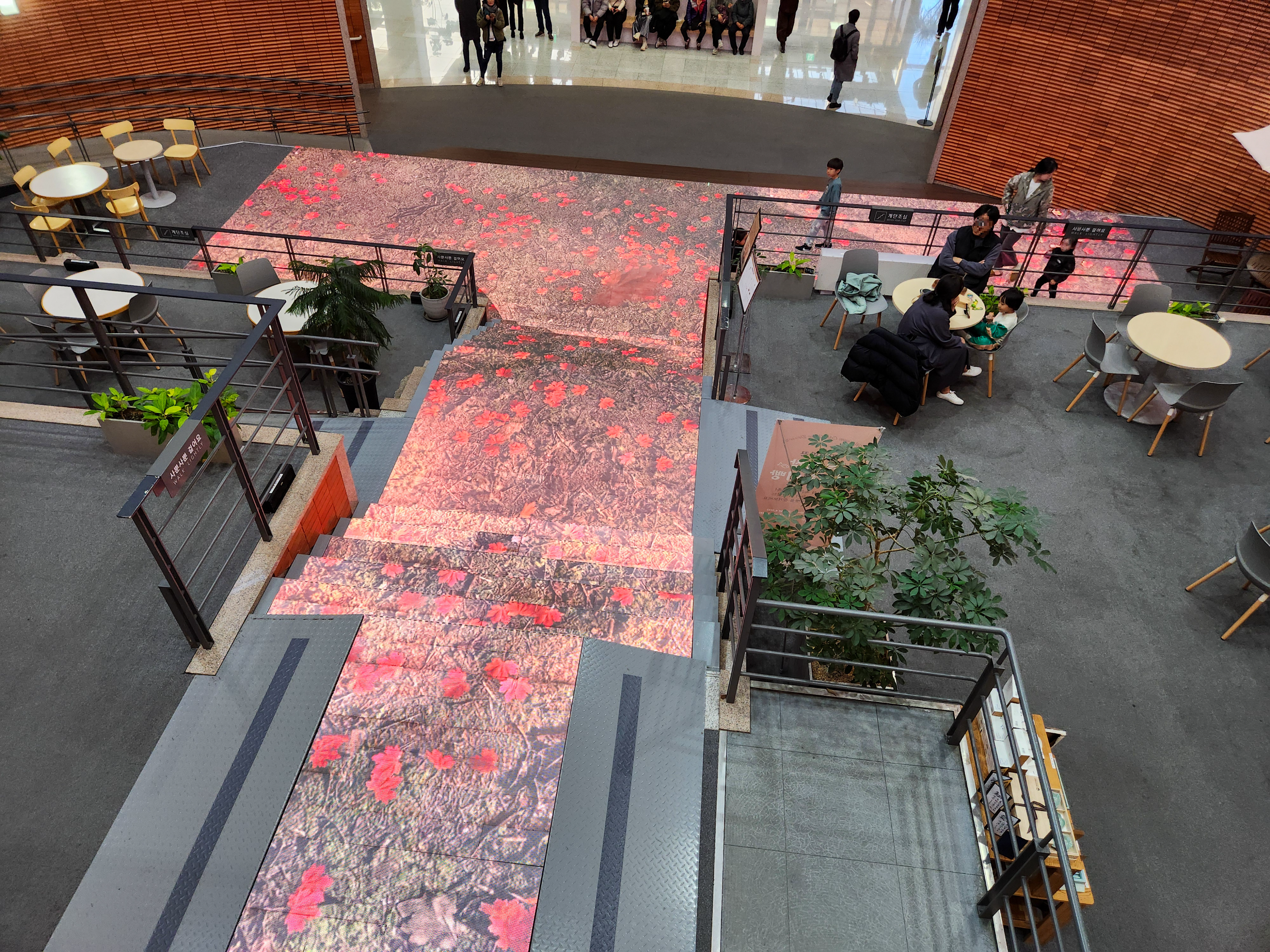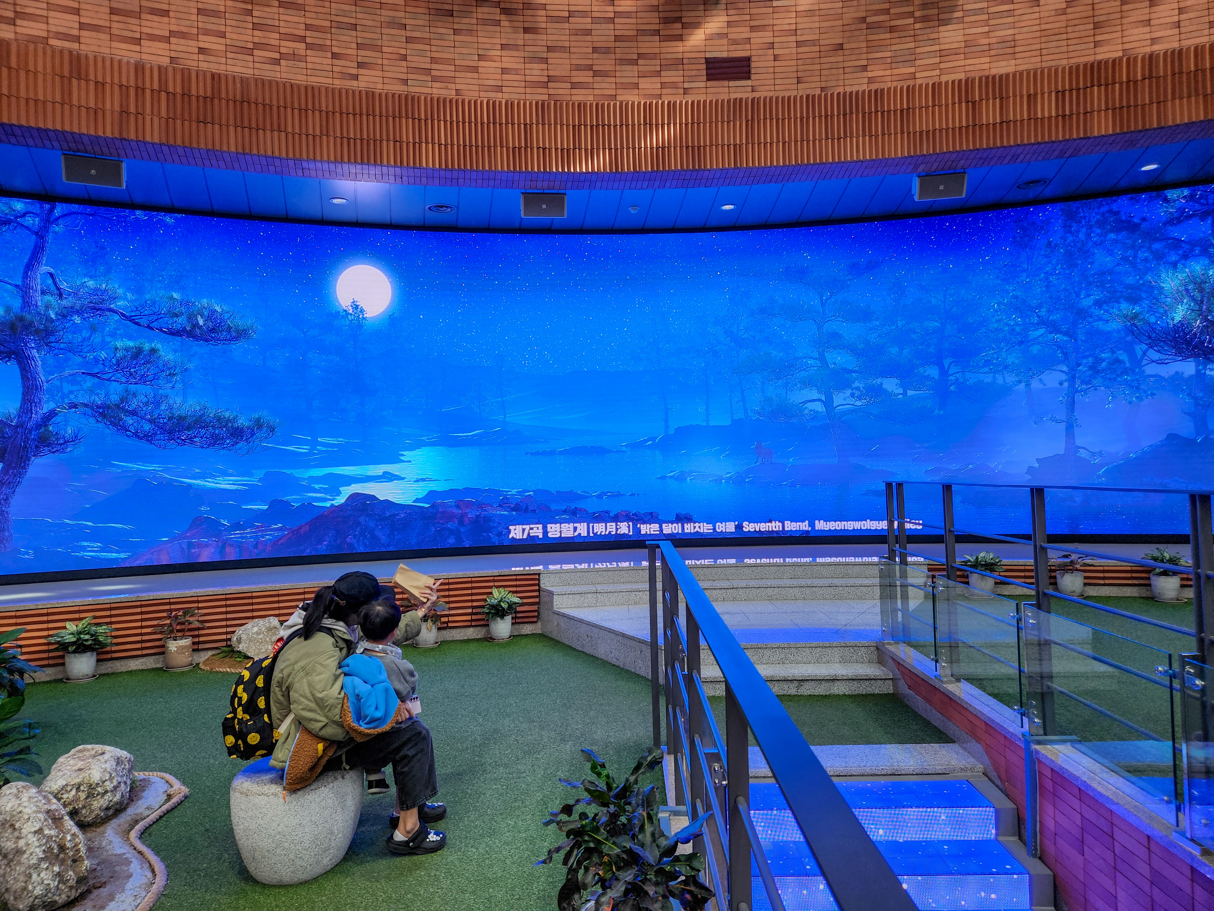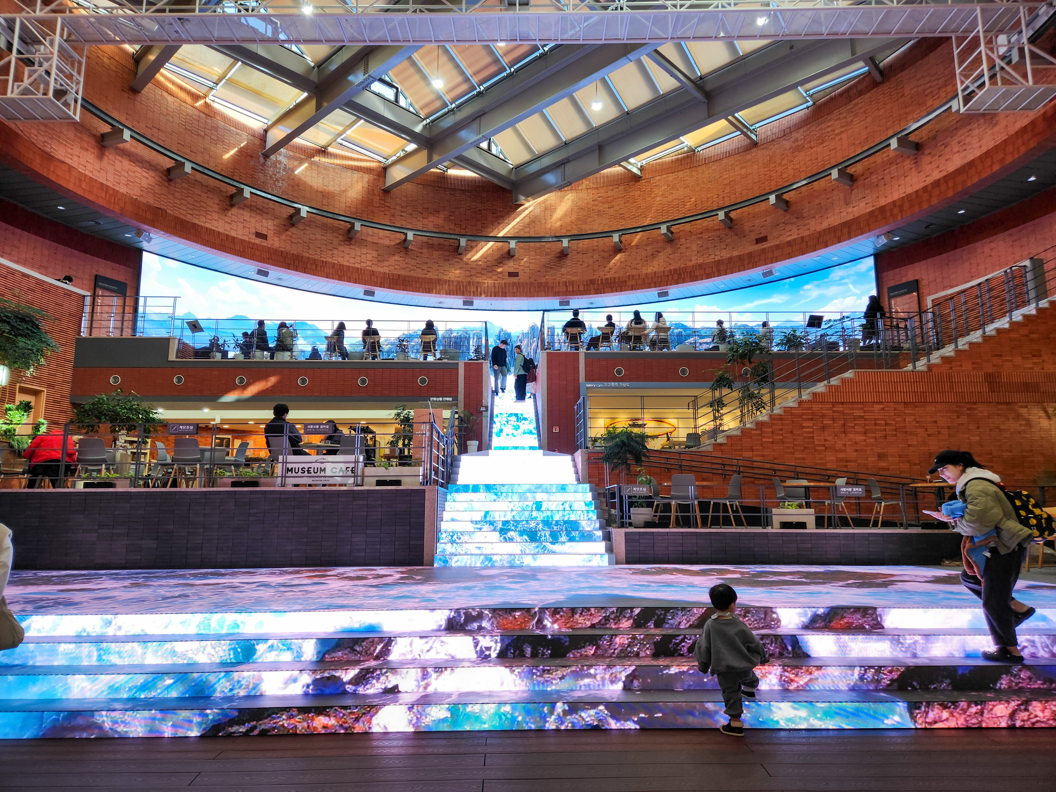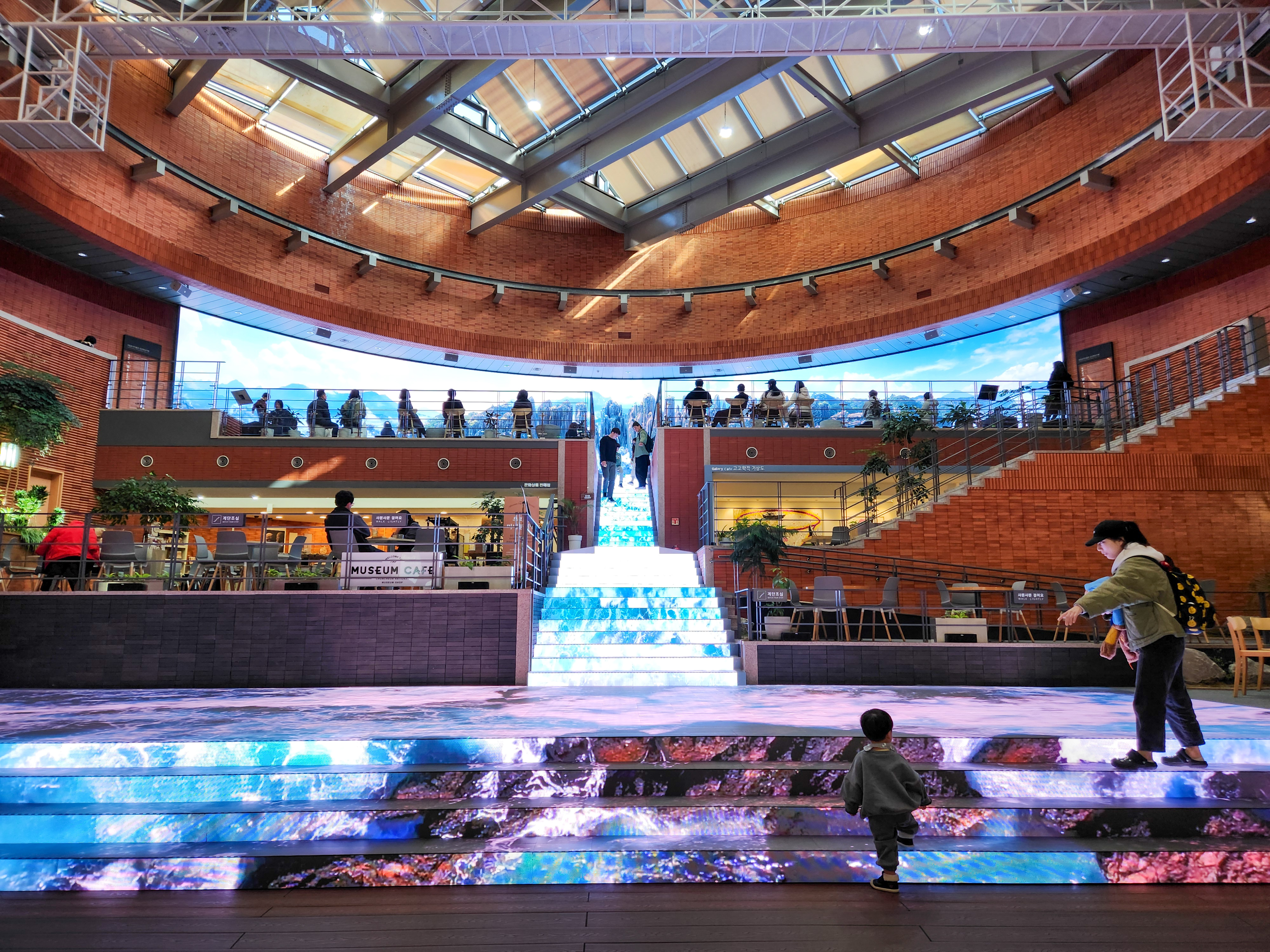 본관으로 들어가면 바로 정면에 1층부터 3층까지 미디어 스크린이 연결되어 있다. 2층은 카페 및 독서 공간이 있고 3층이 메인 스크린이다.