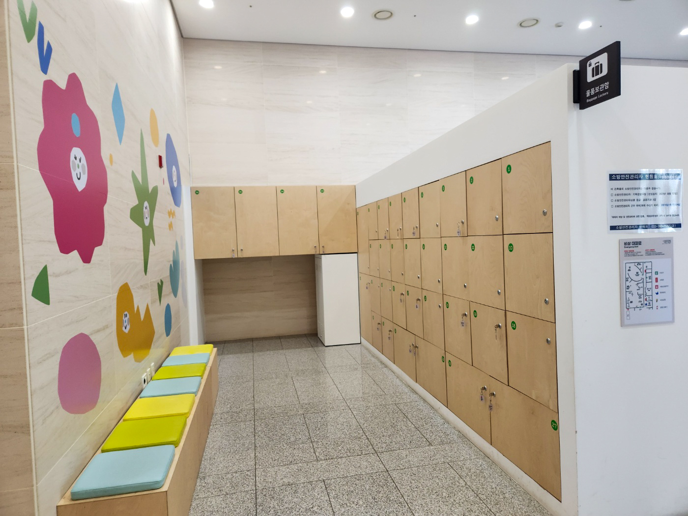 1층에 들어가면 바로 정면에 화장실 및 물품보관함이 있어 큰 짐이나 가방 등을 보관할 수 있다.