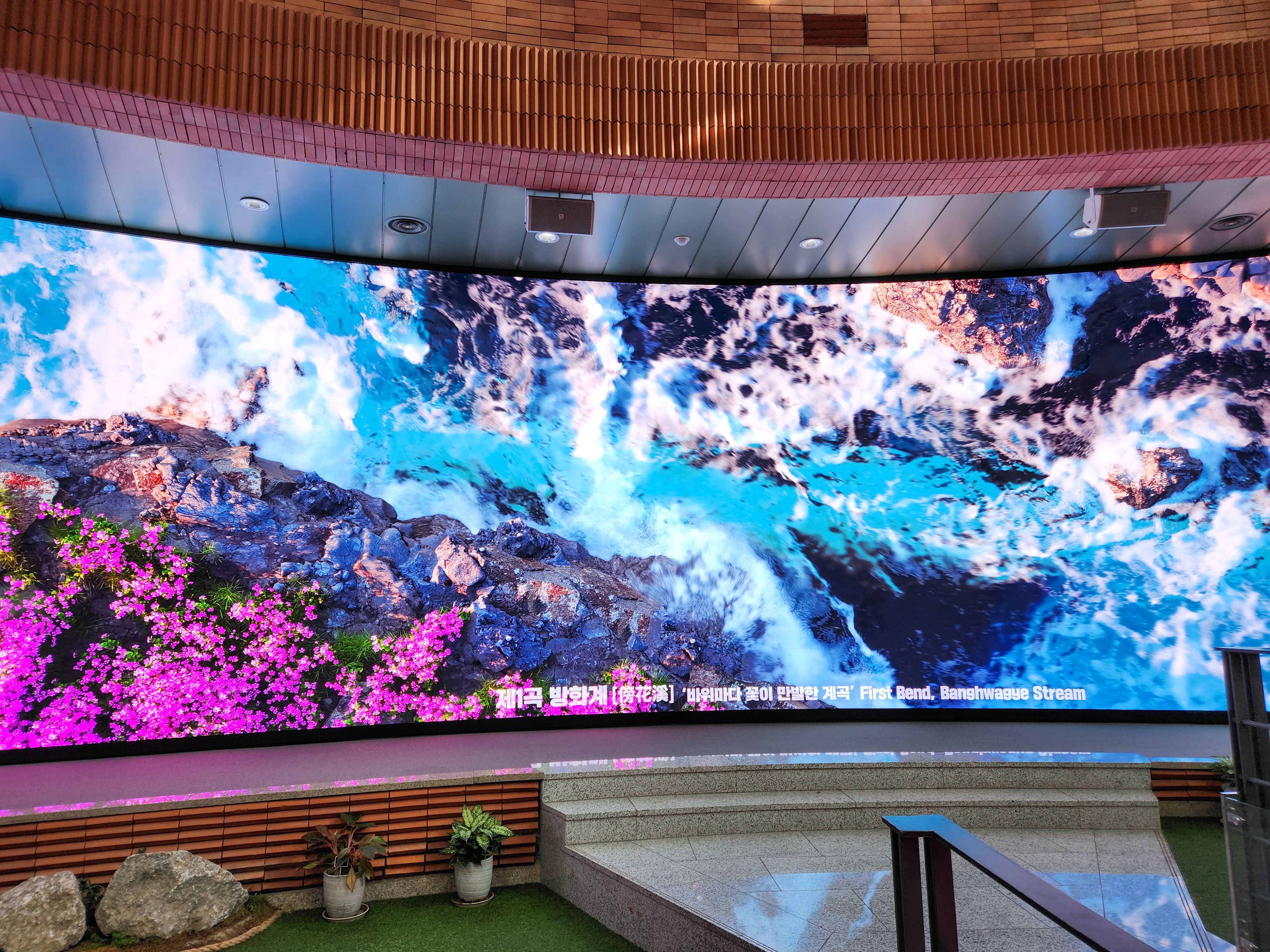 대형 스트린 여러 개가 커브 형태로 연결되어 있는데 정면에서는 사진 1장이 담기지 않을 정도로 크다.